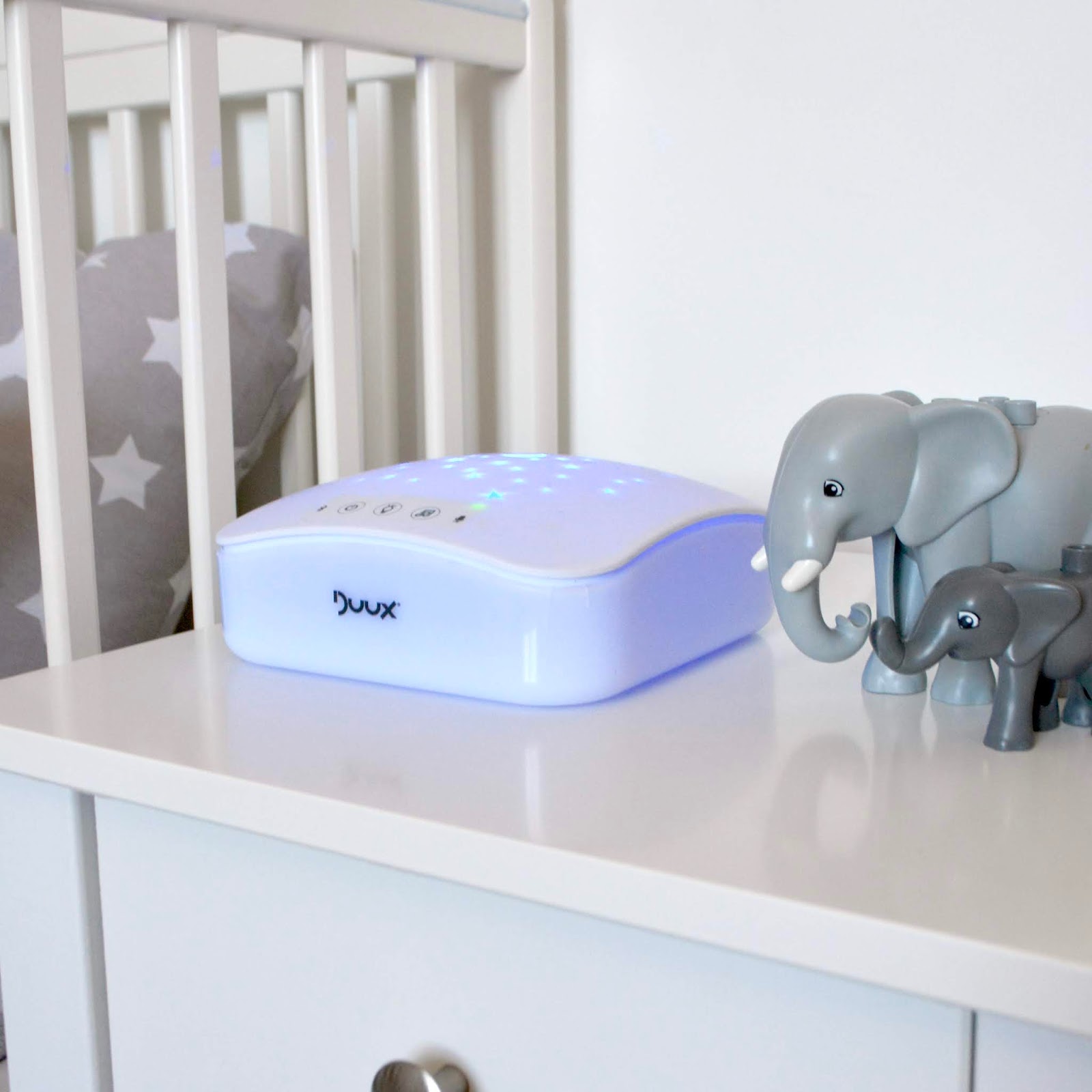 Next to Archie's cot his is bedside table and placed on top of that his is Duux night light. If you're looking for a nightlight for your baby or toddler, I'd highly recommend this one from Duux. Not only does it project stars of all different sizes on to Archie's ceiling, but it also has a noise sensor and when it goes quite in the room, the light will switch itself off, but if it picks up noise throughout the night it will automatically come back on, which is great for those times in the night where Archie might have a little stir. On the odd occasion he will pop back to sleep without me having to go in and comfort him so this nightlight has been really handy and useful. There's also a button on there that allows the sides of the night light to fully light up, which projects enough light to nagivgate the room or do an emergency nappy change in the middle of the night, this has also been really handy to have.
